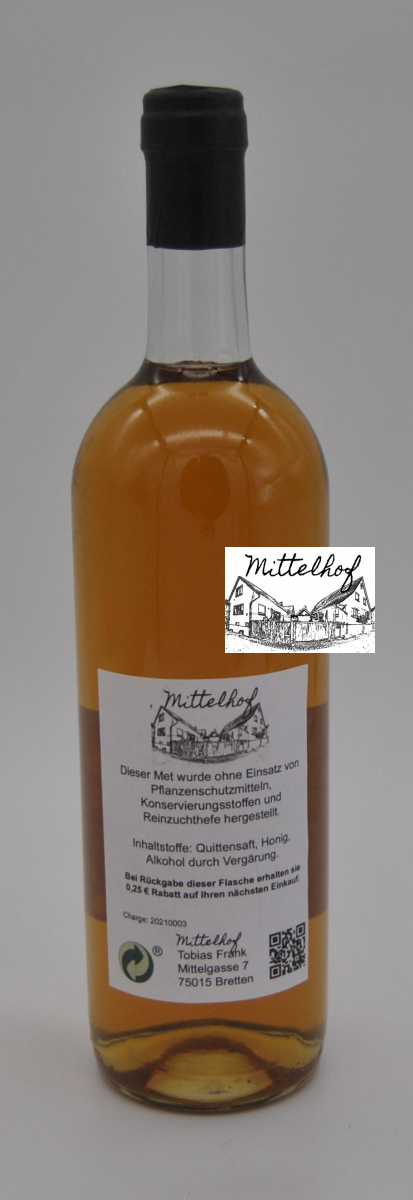 Unser Quitten-Met wird auf Basis von Quittensaft Hergestellt der mit Honig vermengt und vergoren wird.